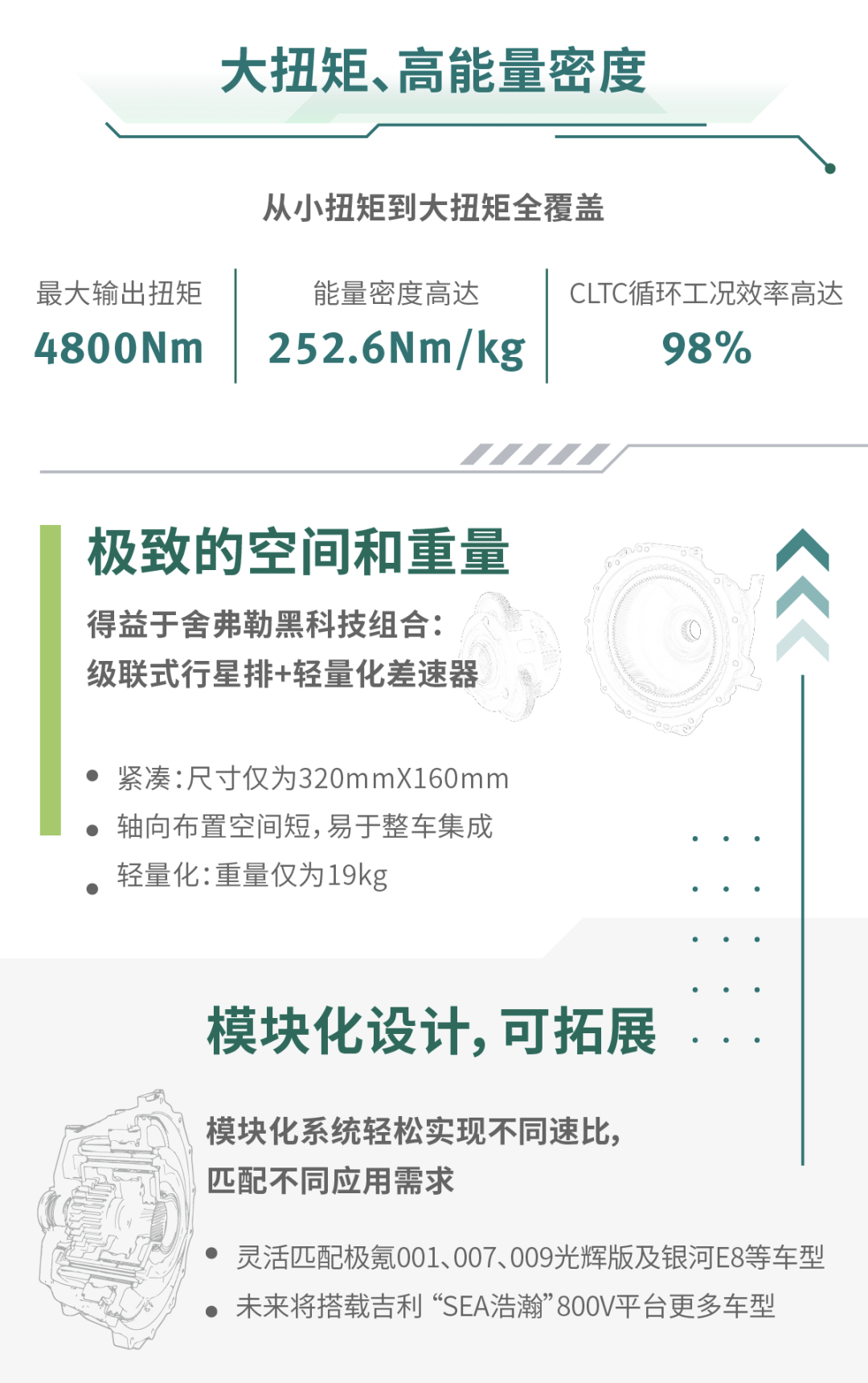 2023年底,舍弗勒面向大扭矩應(yīng)用的高性能同軸減速箱在太倉制造基地投產(chǎn)。4800Nm的最大輸出扭矩,252.6Nm/kg的能量密度,98%的CLTC循環(huán)工況效率,讓這款產(chǎn)品成為舍弗勒在電氣化領(lǐng)域的又一金字招牌。在設(shè)計上,這款產(chǎn)品順應(yīng)各大主機廠的產(chǎn)品布局方向,主要瞄準800V高壓平臺應(yīng)用,提升補能效率。得益于舍弗勒在電驅(qū)動領(lǐng)域豐富的設(shè)計和應(yīng)用經(jīng)驗,這款產(chǎn)品在空間、重量和性能等方面具有顯著優(yōu)勢。