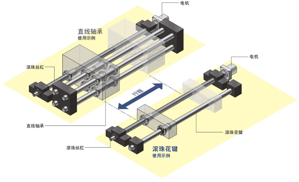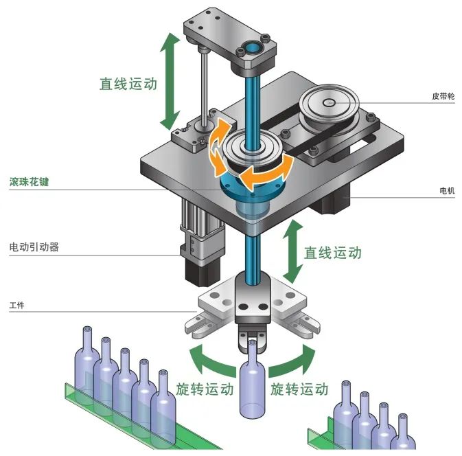 滾珠花鍵通過單軸傳遞扭矩,因此可實現(xiàn)直線及旋轉(zhuǎn)的組合運動。