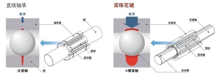 與直線軸承不同,滾珠花鍵具有滾動槽。滾動槽具有與鋼球類似的R形,因此可大幅度增加承載的載荷,實現(xiàn)高承載能力及長使用壽命。與直線軸承相比,其容許載荷為直線軸承的13倍,壽命約為直線軸承的2200倍。